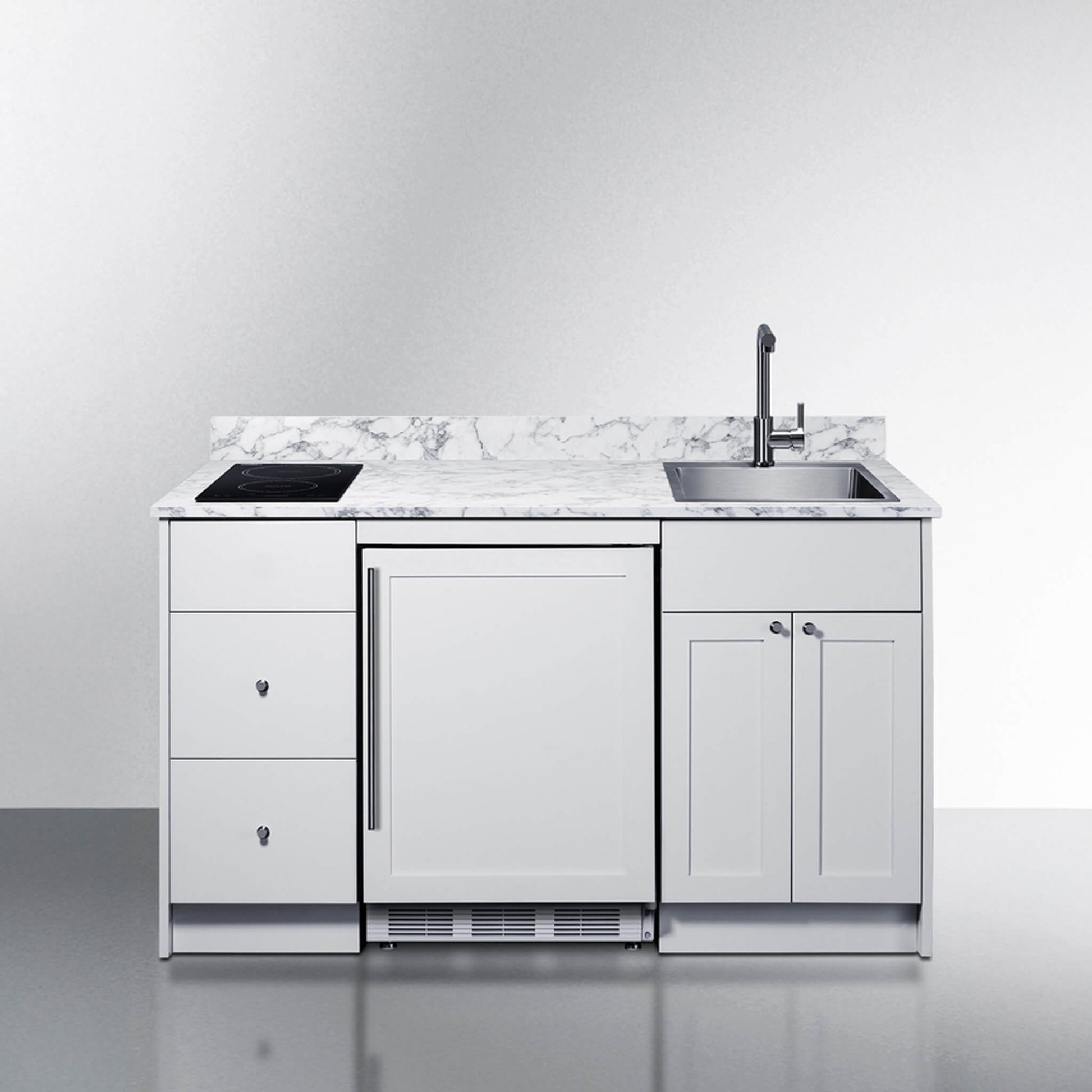 Everything you need for a quick and simple setup is included. The cabinetry features a two-door cabinet under the sink and two soft-close drawers for ample storage. The refrigerator slides perfectly into its designated space, complete with a matching wood panel for an uninterrupted, high-end look. Both the refrigerator and cooktop plug into standard 115V outlets, making installation incredibly straightforward. Stop dreaming about a simple kitchen solution and make it a reality with the Summit Turnkey Caldera Kitchenette.