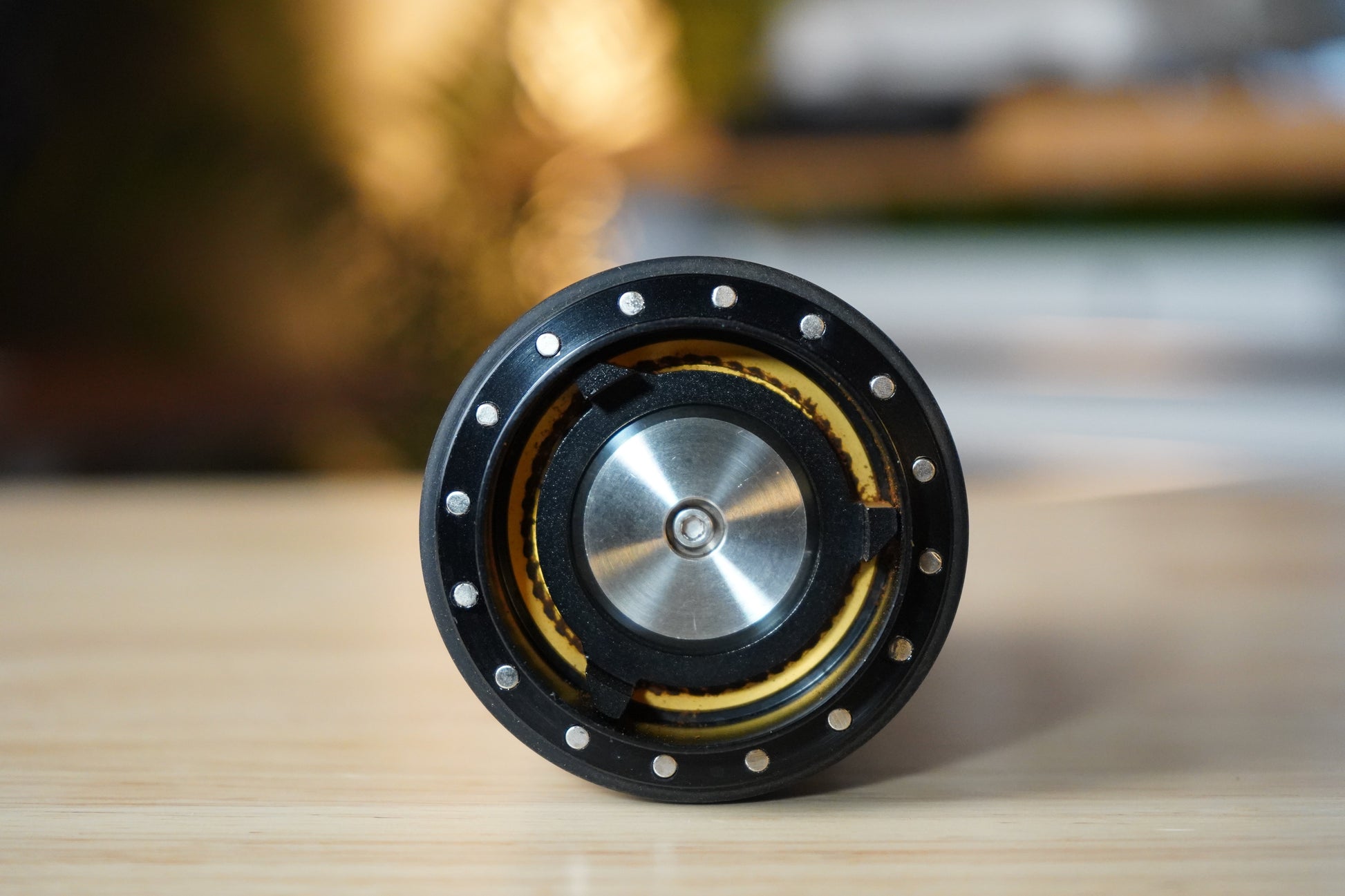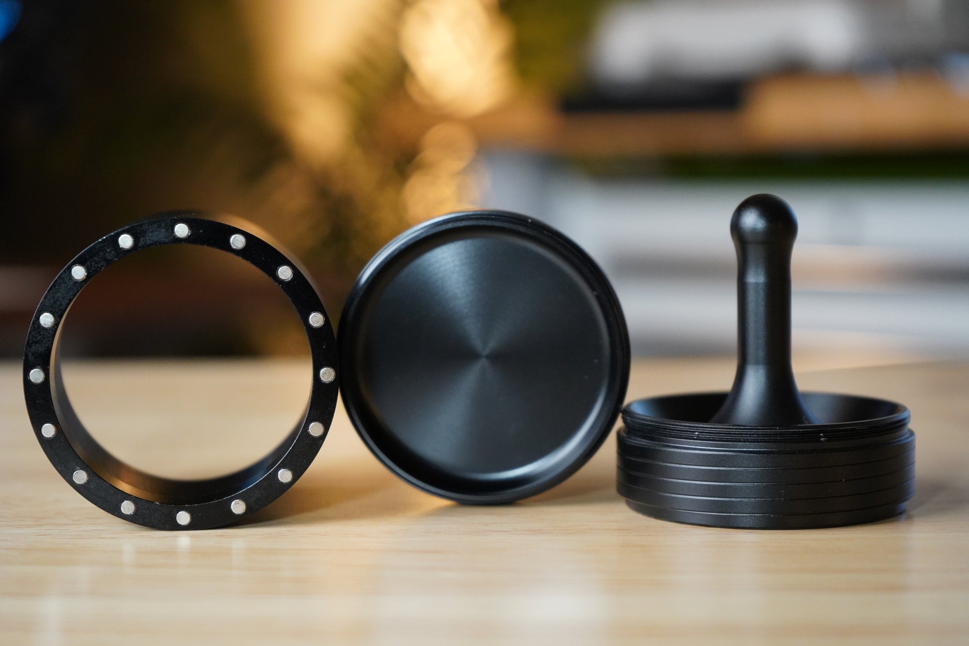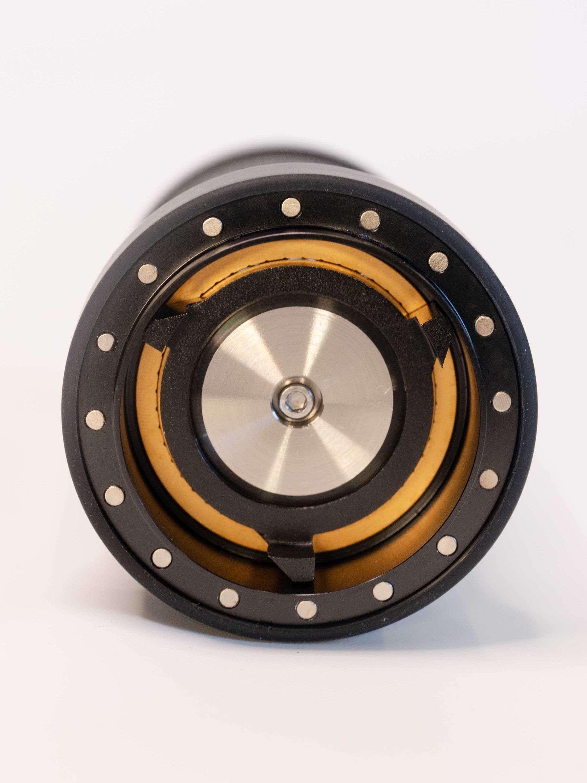 The Turin H63 hand coffee grinder features a combination of an aluminum body, stainless steel burrs (SUS420 stainless), and a stylish walnut wood knob, all designed to provide maximum durability and functionality. The textured sleeve with the Turin Grinders logo provides a better grip while grinding. The dosing cup is held into place with magnets, ensuring a strong connection to the grinder, but also allowing for easy removal. The dosing cup is also designed to operate as a traditional 58mm dosing cup, or with the included blind shaker plunger, can also function as an integrated blind shaker.