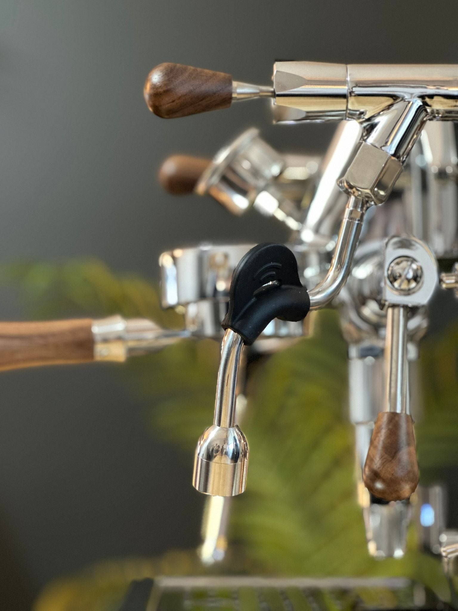 The machine’s black walnut handles on the joystick controls, portafilter, and included tamper add a luxurious touch, elevating the machine’s aesthetic. The joysticks are designed to lock into place, allowing for more ergonomic use. The 58mm portafilter comes with single and double baskets, providing flexibility in shot size, while the included accessories, such as the quality wood-handle tamper, ensure you have everything you need to craft your perfect cup.