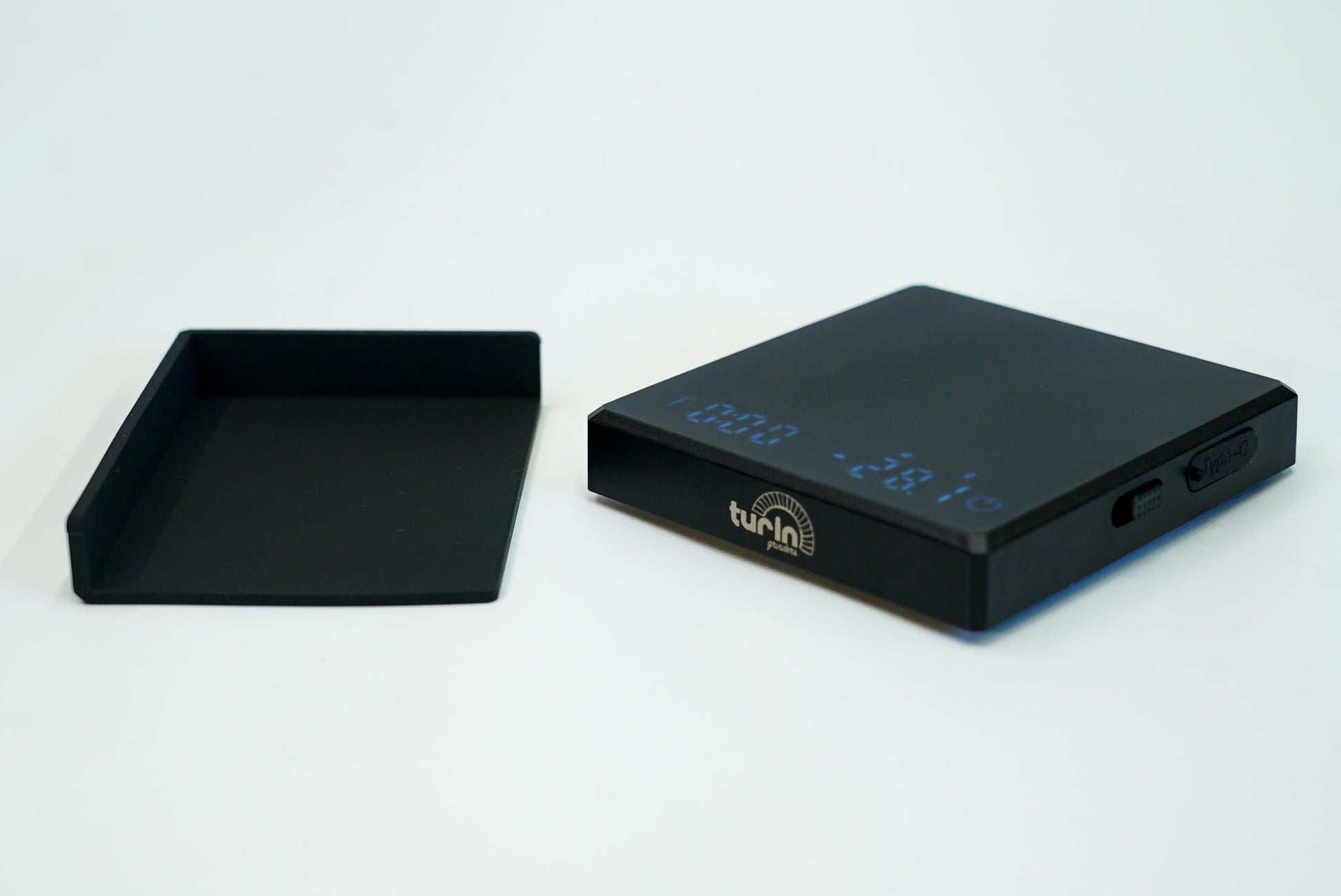 The Turin Mini Espresso Scale is a compact scale ideal for placing on an espresso machine drip tray, measuring 3.6 inch wide x 3.8 inch long x 0.8 inch tall (with rubber pad) and weighs a mere 5.6oz (166g). The Turin Mini Espresso Scale is not only designed for espresso, it is the perfect size if you are keeping portability in mind, fitting easily into an on-the-go bag for pour over brew methods.