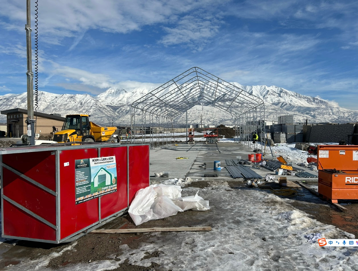 The Gold Mountain Storage Shelter W30’xL80’xH20’ - Double Truss PVC offers ample storage and protection against storms, snow, rain, and sun. It comes with a 3-year warranty, ensuring durability. Ideal for vehicles, materials, tools, equipment, and events, this shelter features a peak design for efficient snow removal and a dome option for extra space. Both designs are equally durable, with PVC fabric providing superior weather resistance and a longer lifespan compared to PE.