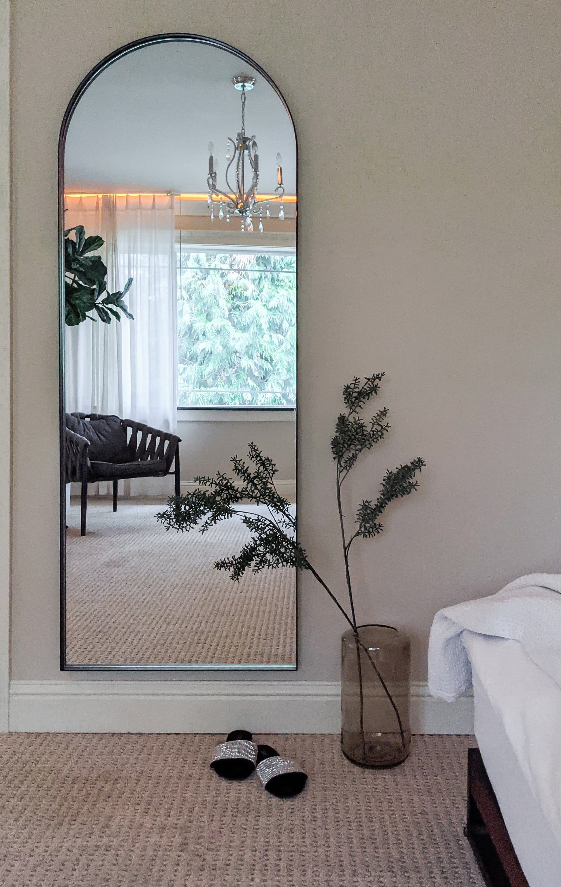 DEEP SET DESIGN Mirror is recessed into the frame. The solid aluminum metal curved corner frame creates a clean minimalistic look.